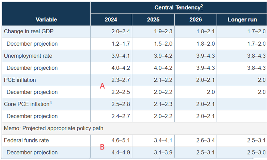 下表一樣是從FED Projection而來的,勞者我稍作調整版面,這是委員們的預測區間,並排除了較極端的樂觀與悲觀值。從下表A點可以得知有委員預測物價最高仍有2.7%的可能(而這不是最悲觀),在B點聯邦基準利率當中,也有著最高5.1%的提倡者,意味今年也許至多只降一碼的人仍在。