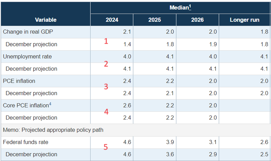 本月FOMC後有釋放各委員對於重要經濟數據的預測,計有:GDP、失業率、物價與聯邦基準利率。會議結束之後市場普遍以上漲作收,上漲因素有很多,例如下圖第一點—聯準會官員把今年美國GDP成長從去年12月的1.4%提高到2.1%,幅度有50%之譜。