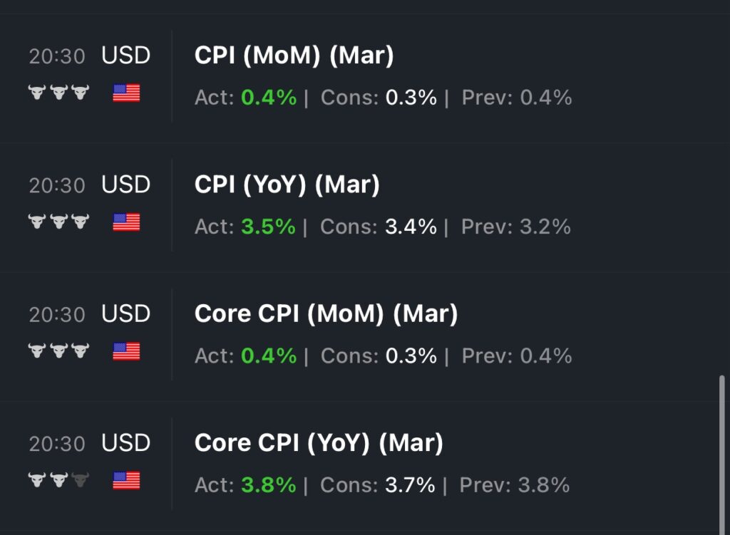 昨日美國公布CPI,市場原本預期3.4%,實際公布3.5%、核心CPI市場預期3.7%,實際公布3.8%,年增率、月增率全部高於預期。看起來物價短期很難降到讓聯準會滿意啊。