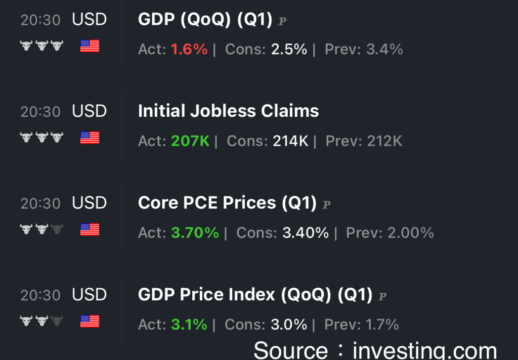 道瓊前一天收盤38,460,開盤即大跌,最低為37,754點,跌了超過700點,跌幅1.8%,主因是美國公布GDP過低,且季率年化核心PCE過高,引發投資者對於美國經濟陷入成長低迷、通膨頑強的停滯性通膨擔憂。不過收盤卻拉回到38,085,雖然還是下跌,但收復一半失土。