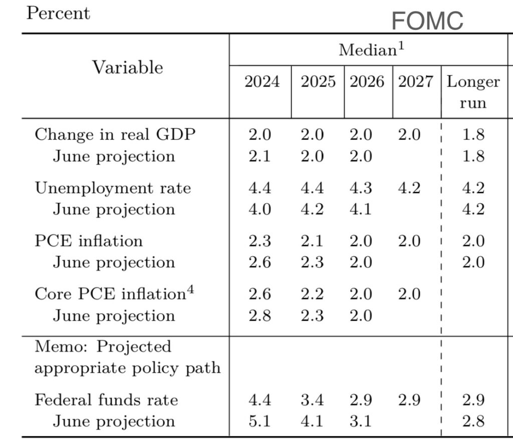 GDP的預測幾乎無變動,僅把今年2024年的2.1%下調到2%,明後兩年皆維持在2%不變。(此2%不代表不佳,相反的,在成熟超大型經濟體來說2%已算合格)但幾無變動不就代表FED認為未來沒有太大亮點或暗點?