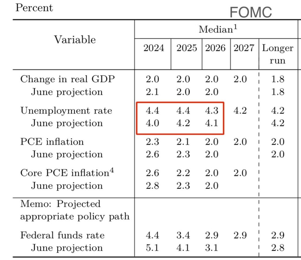 同樣,今年初的預測失業率為3.9%~4.1%到本次的4.3%~4.4%,減速的態勢明顯,應該是聯準會決定動作的主因。