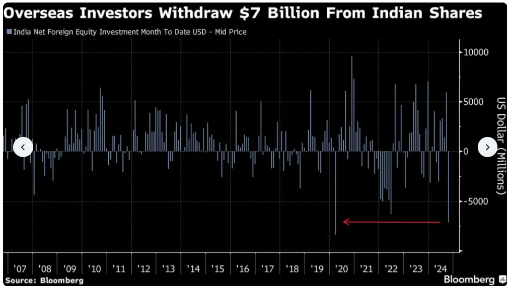 一,外資流出:以分析師Alex Gabriel Simon and Chiranjivi Chakraborty的圖表來看,明顯可以發現今年以來印度股市的流出已接近2020年3 月左右水準,若以海嘯後來看,歷史流出量甚至排名第二,更甚2022年美國升息。
