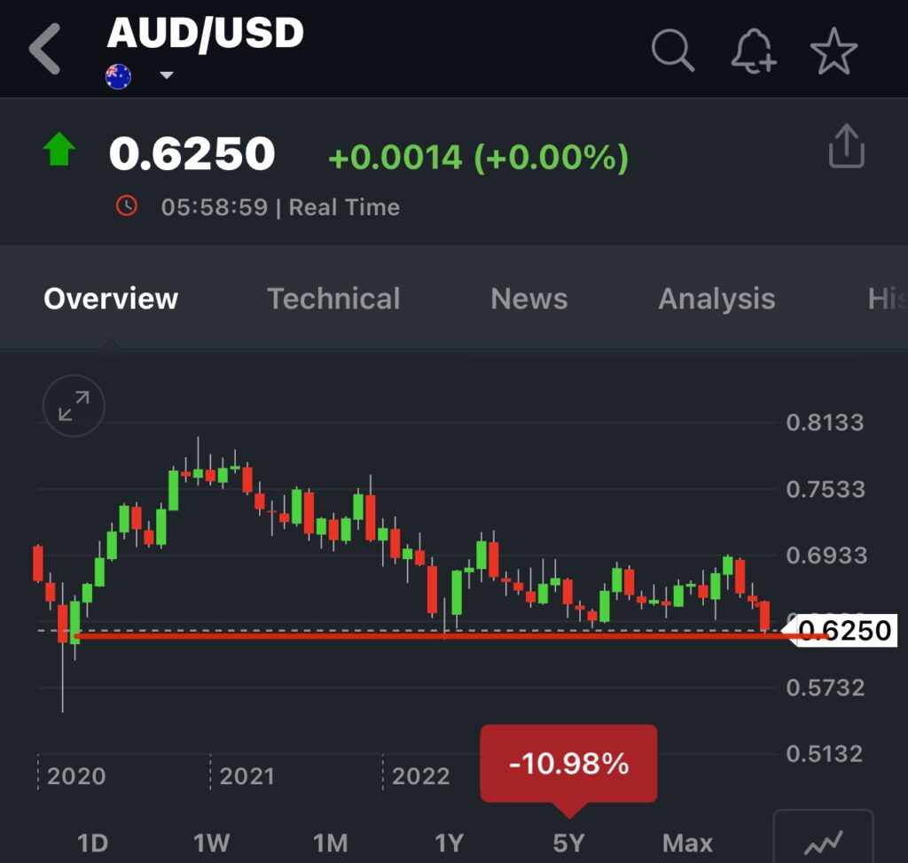 關另外一個觀察的指標就是今年都不太降息的澳幣,理論上應該要比美元來得強,但是它是卻率先一直往下跌,月初的時候我還在想他會不會跌破0.63,當時大概0.635左右;結果還不到一週直接灌破,下一個關卡應該就是0.6整數了。