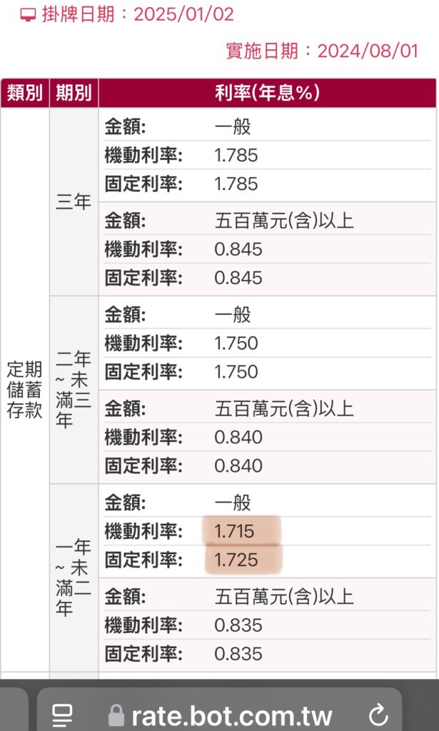 下圖是臺灣銀行在2025年1月2日的利率報價。可以明顯看到利率有分為固定與機動(下圖紅筆),而且年限越長利率越高。