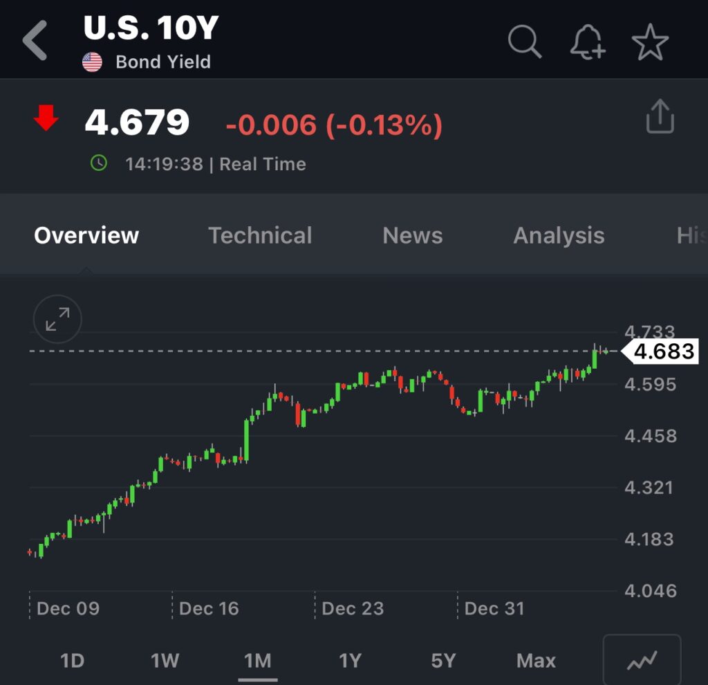 殖利率在聯準會釋放出今年可能只有降息兩次,而利率期貨直接悲觀到只降息一次的情況之下,十年期公債殖利率又突破了4.6%,而且已經是在短期之內連續上漲超過這個價位。(如果從聖誕節開始算起已經是連續七天。)