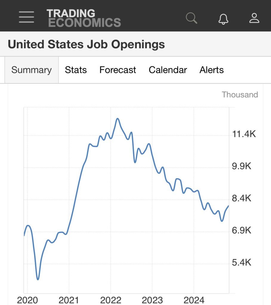 昨天股市修正主要的原因,是因為美國公布職位空缺數比預期來得高。2024年11月的數值為784萬人,專家預期12月應該是在773萬人,結果公布後為809萬人,遠高於市場預期。