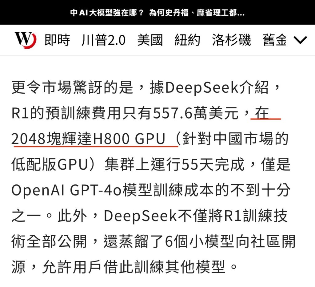不過先來看一下這個新聞紅線上面有講,雖然訓練費用只有500多萬美元,但是他是在2048 塊NVDA的H800 GPU上面做運算。光一塊GPU成本大約30,000美金,所以2048塊基本就需要8000多萬美金,而且這是算台灣這種沒有限制的國家才用$30,000美金,其他國家可能都是要加價購買。