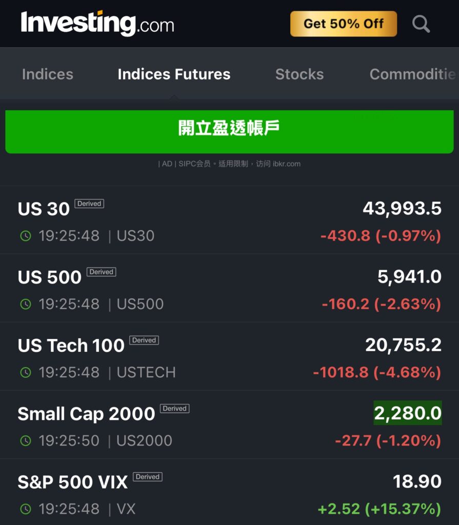 開盤前三大指數期貨普遍下跌,道瓊跌幅最少還不到一%,S&P 500跌幅2.6 %,那斯達直接蒸發一千點。