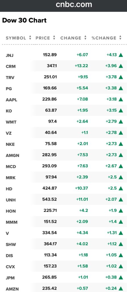 至於昨天所上漲的道瓊,表現比較好的公司就是以下:嬌生、C R M、旅行家集團、寶鹼、蘋果、可口可樂的都上漲超過3%以上;WalMart、verizon、 Nike、安進、麥當勞跟莫克藥廠也都上漲2.5%以上。