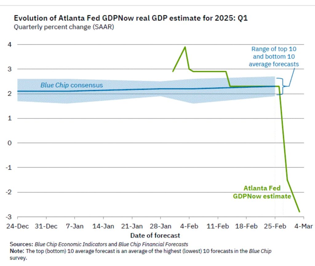 根據新聞報導,亞特蘭大聯準會公布今年第一季美國經濟學係數調整後的實質GDP將會衰退2.8% ,比二月二十八日所公布的衰退1.5%來得更高。
