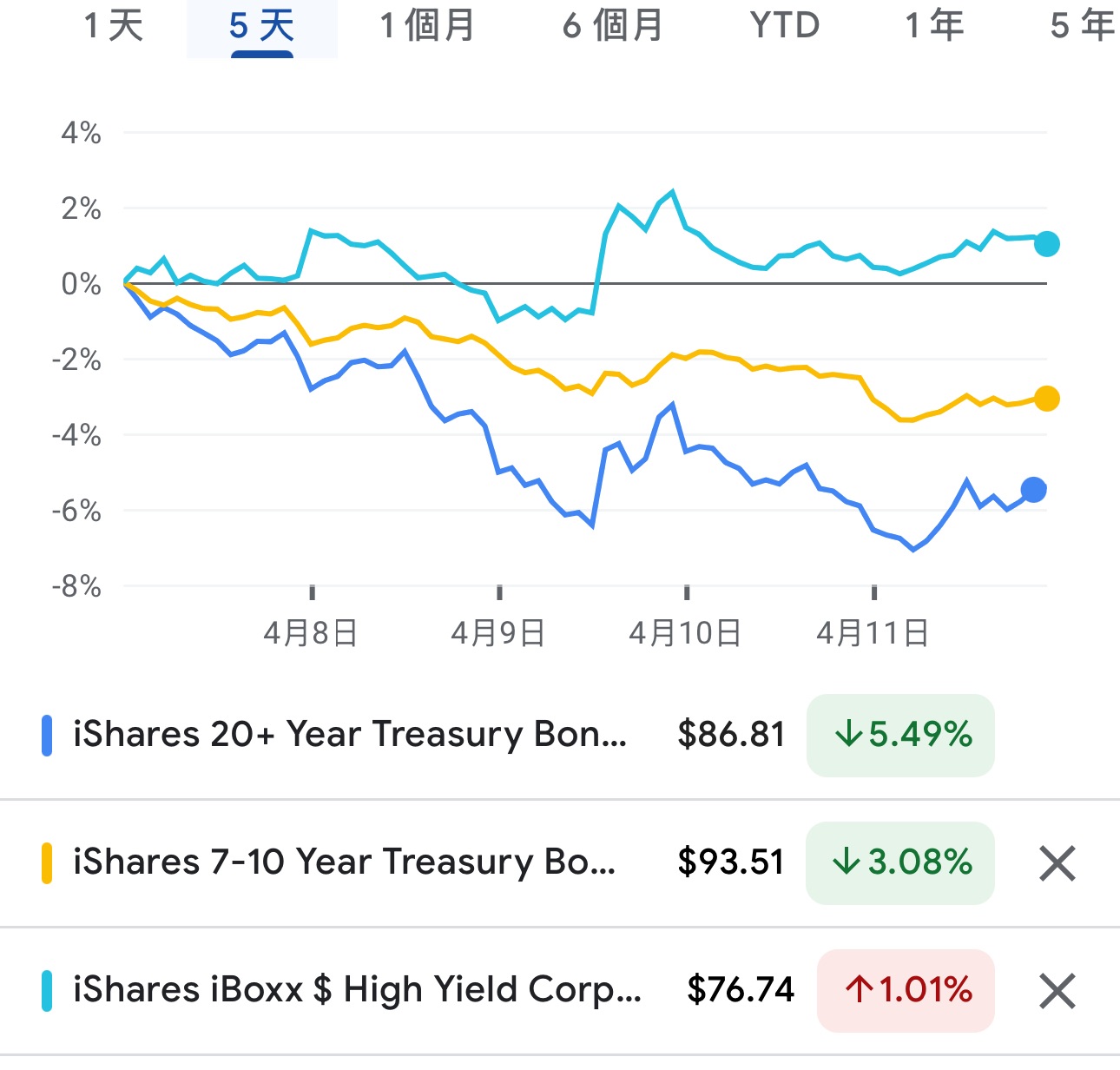 我們可以從上圖看到,在一個禮拜之內,二十年期公債下跌了5.49 %、七到10年期的公債下跌了3.08 %、可是標榜高收益債的債券指數ETF反而是上漲的1.01%。