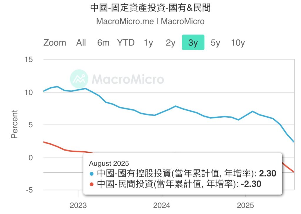 如果我們把它拆分為國家跟民間兩種類別的組合,甚至可以發現有維持0.5%動能的是國有控股公司的投資,整個民間甚至還是衰退的,幅度達到2.3%。