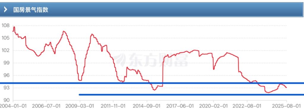 如果我們從國家房地產經濟指數切入,會發現中國政府做了滿多的政策,但是這兩年房地產景氣幾乎就是躺平在地上。甚至連2015年最悲觀的時候都比現在好。
