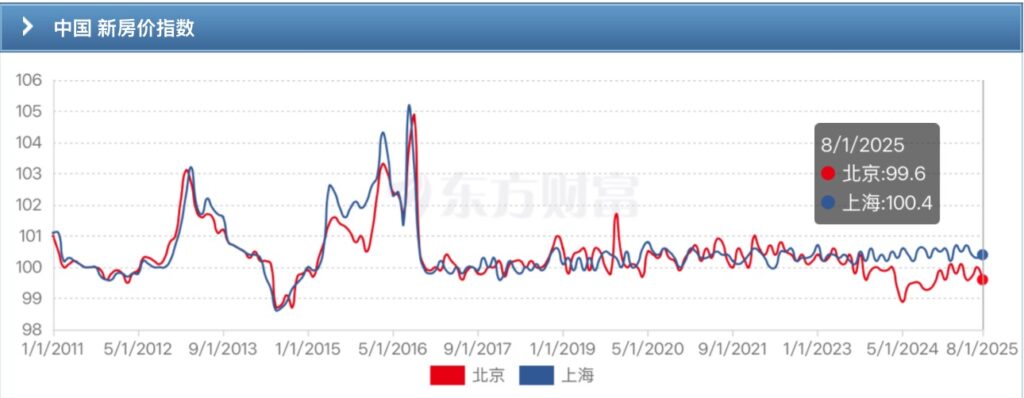 如果我們觀察北京跟上海這兩個城市的房價會發現大概2017年以來幾乎都沒什麼動靜,直接躺平。